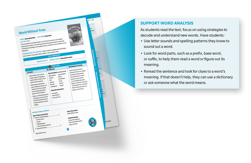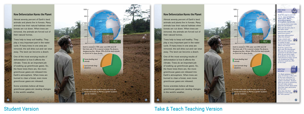 In these pages from World Without Trees, a small-group book from the Grade 3 kit, you can see that the teaching version on the right is identical to the student version on the left in every way except for the additional teaching panel, which includes detailed notes for guiding the lesson in real time and for explicitly supporting a wide range of reading skills, including decoding, word analysis, vocabulary, comprehension strategies, critical thinking, and the structure and features of complex texts.