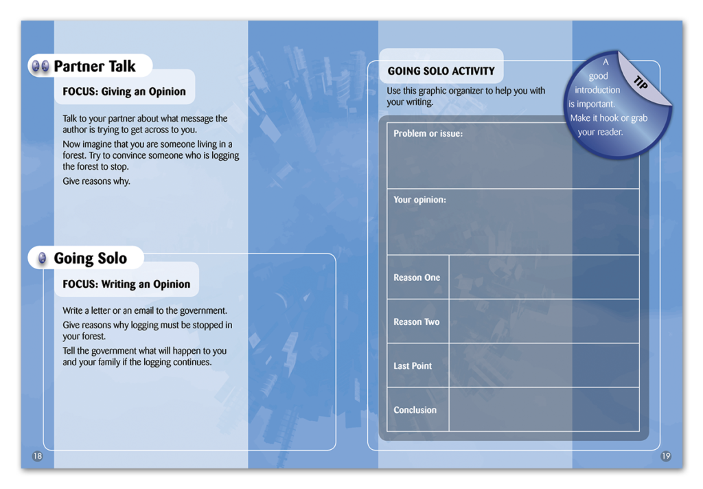 Inside the books, Partner Talk and Going Solo activities on the final few pages springboard from reading to talking to writing on topics related to the books — in this case, giving a well-reasoned opinion supported with facts (something many students struggle with).