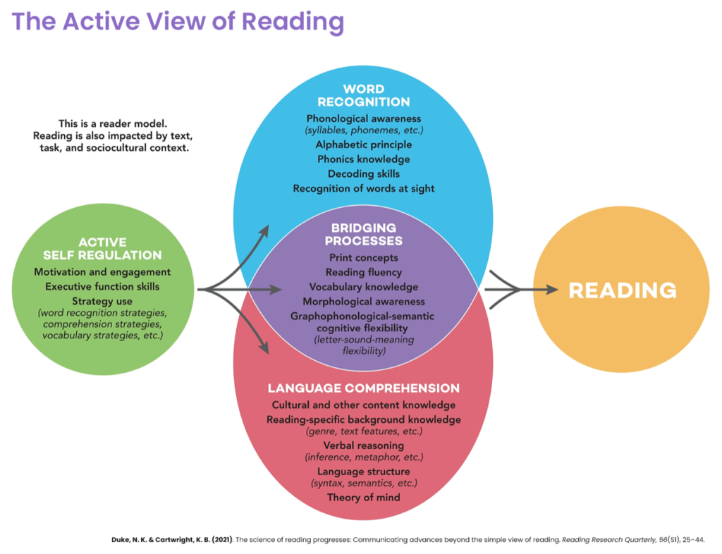 Models like the simple view of reading and Scarborough’s reading rope have attempted to capture the skills required for proficient reading. The most recent and comprehensive model is the active view of reading developed by Nell Duke and Kelly Cartwright.