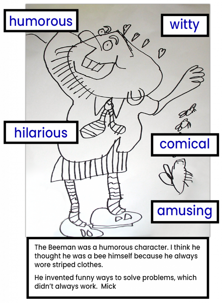 In this example, I used Mick’s response about the Beeman to call out the synonyms humorous and funny and to expand students’ vocabulary by listing additional synonyms.