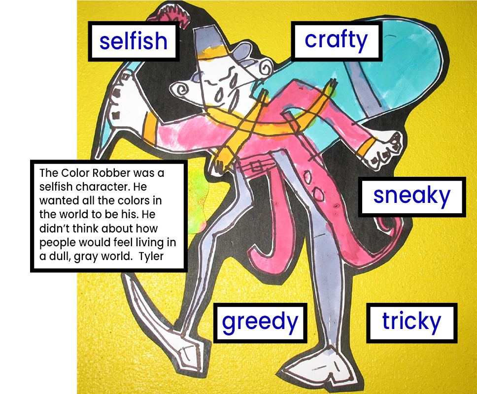 Here is another example, where I used Tyler’s response about the Color Robber to focus on other adjectives students could use to describe the character.