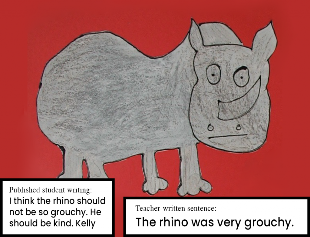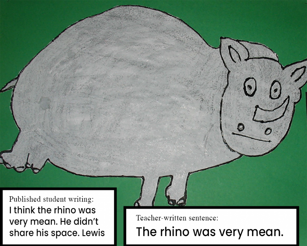 Here is a piece of artwork that Lewis, a kindergarten student, created in response to the shared book, Grumpy Rhino. When Lewis finished his artwork, I asked him to tell me something about his picture. This I wrote on the back and later typed and attached to his work.
